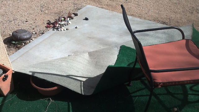 Yes, the wind had picked up one corner of that outdoor astroturf and flipped it along with a metal bowl of rocks that were meant to hold it down.
